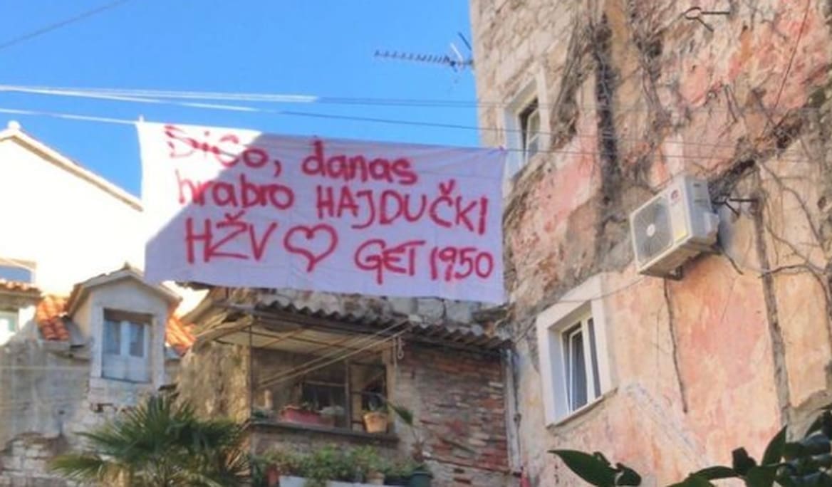 "Dico, danas hrabro HAJDUČKI. HŽV - GET 1950", piše na transparentu koji je postavljen u splitskom Getu.