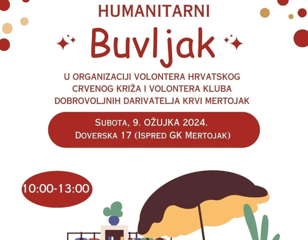 U subotu 9. ožujka volonteri Crvenog križa Mertojak i Kluba dobrovoljnih darivatelja krvi Mertojak organiziraju humanitarni buvljak. Buvljak će se održati ispred prostorija Gradskog kotara Mertojak u Doverskoj 17 u Splitu. Vrijeme održavanja je od 10 do 13 sati.