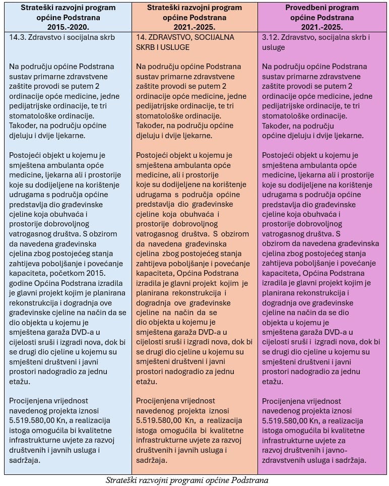Kako bi isto mogli dokazati i prezentirati temu koja se odnosi na zdravstvenu skrb, prikazati ćemo preko 3 tablice (stupca) u kojima ćemo kopirati tekst iz strateških razvojnih programa (2015.-2020. i 2021.-2025.) kao i provedbenog programa općine Podstrana za razdoblje od 2022. – 2025. godine. Na prikazani način najbolje možete uočiti razlike u tekstu.