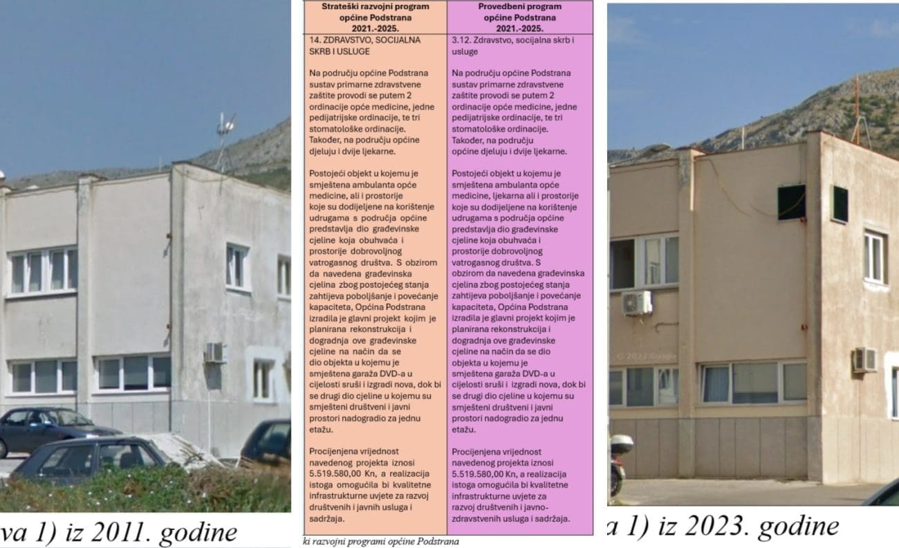 Kako ističu, Općina Podstrana, jedna od najmlađih u Hrvatskoj, u strateškim razvojnim programima (2015.–2020. i 2021.–2025.) te provedbenom programu (2022.–2025.) godinama najavljuje rekonstrukciju zgrade u Kaštelančićevoj 1 za poboljšanje zdravstvene skrbi i društvenih sadržaja. Ipak, do 2025. godine realiziran je tek minimalan zahvat – zamjena prozora u WC-u pedijatrijske ordinacije. Budući da se novi planovi uglavnom svode na „copy-paste“ prethodnih dokumenata, očigledno je da konkretnog napretka i ostvarenja postavljenih ciljeva nema.