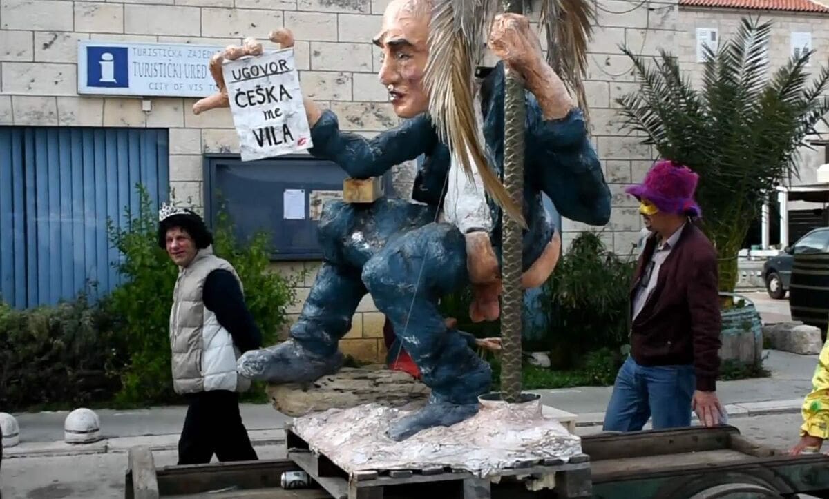 Radicu su provozali kroz cijelo mjesto, a Krnje je u ruci imao natpis "Ugovor, češka me vila" čime su Višani očito aludirali na aferu prodaje Češke vile.