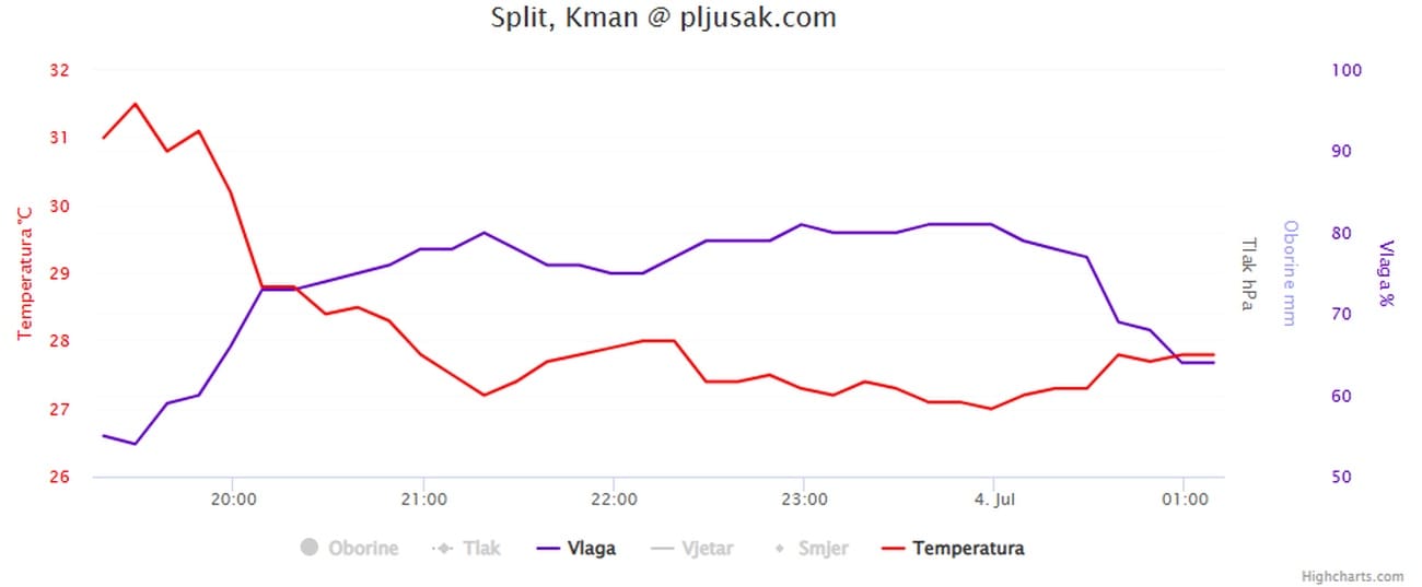 Vrijedi spomenuto da je noć za nama bila vrlo "teška", ali ovoga puta krivca ne treba tražiti u fenskoj buri jer je ona većinom izostala, osim podno Velebita gdje je i sredinom noći bilo oko 30°C. Ovoga puta temperature zraka većinom nisu dosezale 30°C, ali je bilo još neugodnije i to zbog visoke koncentracije vlage u zraku. Primjerice, na širem splitskom području iza ponoći je bilo 25 do 27°C, ali je osjet topline bio vrlo izražen zbog 70-ak posto vlage u zraku.