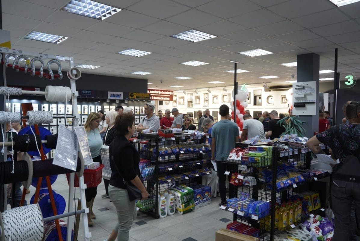 Mnoštvo je krenulo u novu poslovnicu čim se vrpca prerezala. a redovi na blagajnama pravi su dokaz povjerenja i lojalnosti kupaca prema Građi. Proslava traje četiri dana, a danas je posebna akcija od čak 40 posto na cjelokupni asortiman. Osim toga, za sve prisutne organizatori su pripremili besplatnu hranu i piće, a cijelim parkingom se ori zvuk dalmatinskih pjesama.