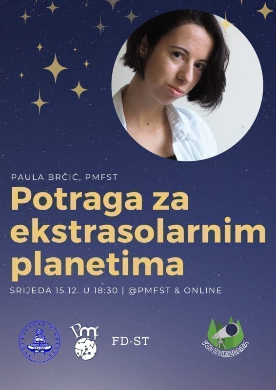 Paula Brčić, studentica Astrofizike i fizike elementarnih čestica na PMF-u Split te dugogodišnja članica Zvjezdanog sela Mosor i Fizikalnog društva - Split, održat će predavanje o potrazi za ekstrasolarnim planetima.