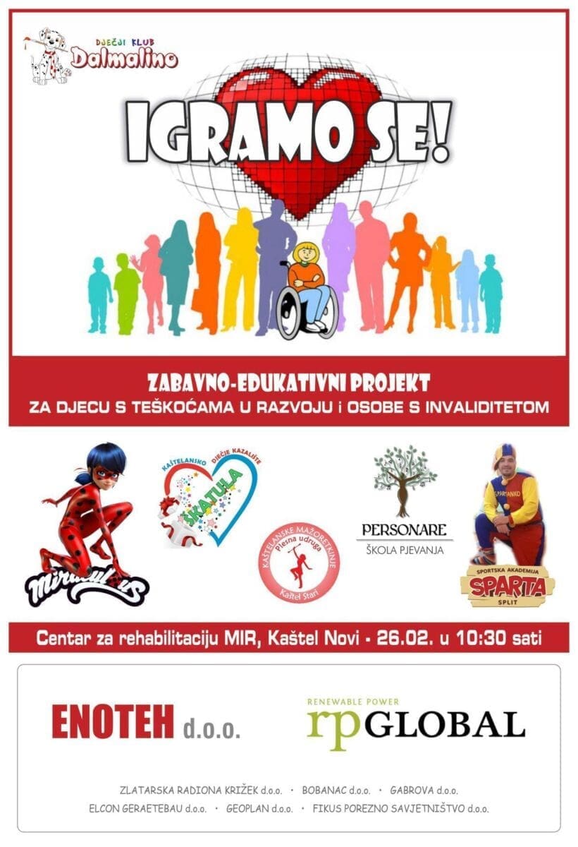Zabavno - edukativni projekt "IGRAMO SE!", za djecu s teškoćama u razvoju i osobe s invaliditetom održat će se 26. veljače, srijeda u Centru za rehabilitaciju MIR, Put mira 16 - Kaštel Novi s početkom u 10:30 sati.