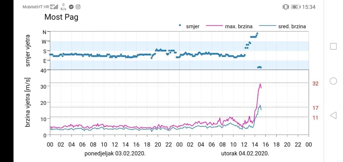 Znatno jači vjetar puše na Jadranu. Od 15 sati bura naglo jača u Podvelebitskom kanalu. Na Paškom i Masleničkom mostu do 16 sati izmjereni su orkanski udari bure do 124 km/h. To je samo početak dvodnevne bure i tramontane koja će vrhunac jakosti imati u srijedu navečer kada će bura ispod obalnih planina ponegdje imati udare preko 150 km/h.
