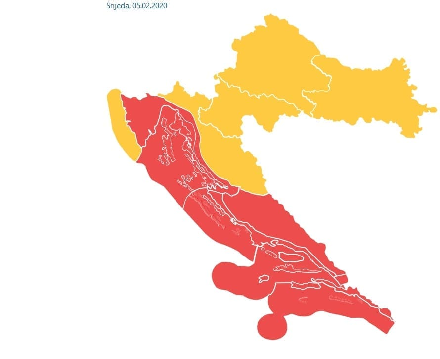 Večeras slijedi prestanak oborine i razvedravanje, ali i jačanje bure i tramontane. DHMZ je, unutar sustava MeteoAlarm, izdao crveni stupanj upozorenja zbog vjetra za cijeli Jadran.
