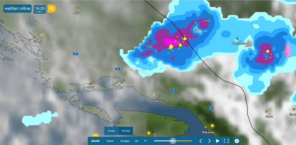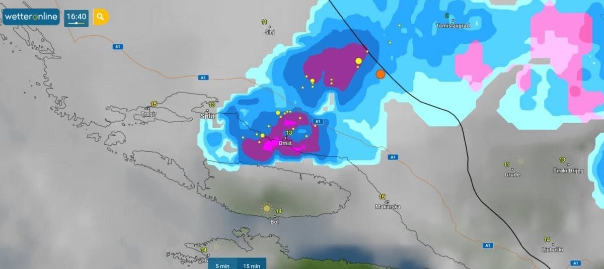 Hladna fronta između 16 i 17 sati prelazila je područje srednje Dalmacije. Bilo je prolazne kiše, pljuskova i grmljavine, a ponegdje i tuče. Tako se od tuče zabijelila okolica Trilja, a tuče je bilo u Kaštelima, Dugopolju, Žrnovnici, Sitnome...