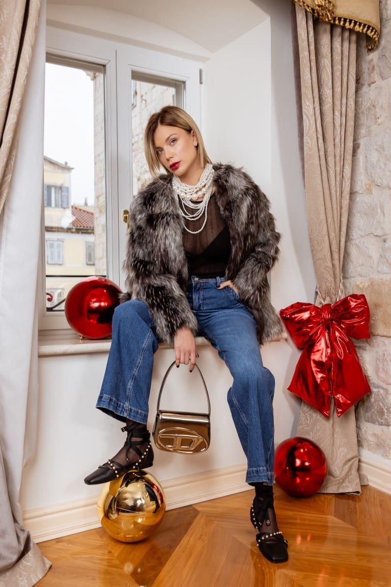 Najdraži mjesec u godini ne možemo zamisliti bez druženja na otvorenom koje volimo provoditi u zagrljaju tople jakne. Siguran odabir za svaku priliku svakako je kombinacija jeansa i crnog topa. Uz bogatu ogrlicu od bijelih perli i trendi jaknu od umjetnog krzna, spremni ste za adventska druženja na omiljenim kućicama!
