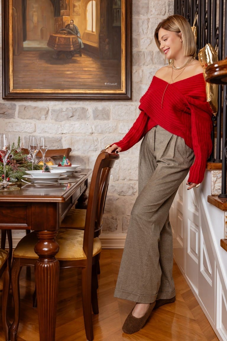 Ako bismo trebali izdvojiti najdraže trenutke prosinca, to bi svakako bili trenuci okupljanja za blagdanskim stolom. U svečanom ambijentu, uz drage osobe, biramo komade u kojima ćemo se osjećati ugodno i nesputano. Jokerova stilistica za ovu je prigodu odabrala mekano pletivo i trendi hlače širokog kroja, koje je uparila uz zanimljive balerinke, puno nakita i zlatnih detalja za potpun svečarski dojam.