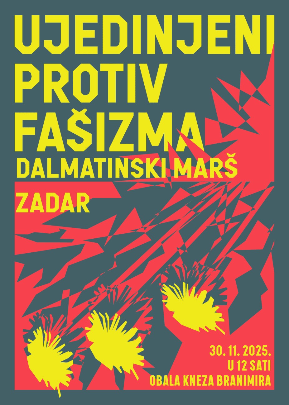 U Zadru se u nedjelju održava prošireni prosvjedni marš "Ujedinjeni protiv fašizma", koji će, prema najavi organizatora, okupiti sudionike iz cijele Dalmacije. Marš je zakazan za nedjelju, 30. studenoga 2025. godine, s početkom u 12 sati na Obali kneza Branimira.