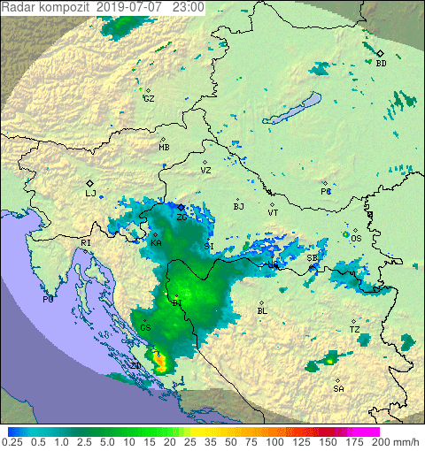 Prema radarskom opažanju, olujni sustav se na zadarskom području našao oko 23 sata po lokalnom vremenu (slika 3). Žutom i crvenom bojom na radarskom prikazu prikazana je zona najintenzivnijih oborina za taj trenutak. Naznake mogućeg razvoja nevremena računalni sustavi su davali već danima ranije, premda s nešto manjom prostornom i vremenskom točnošću nego u priloženom primjeru. Rana najava ovakvih pojava vrlo je bitna zbog potrebe obavještavanja javnosti o mogućnosti pojave opasnih vremenskih prilika.
