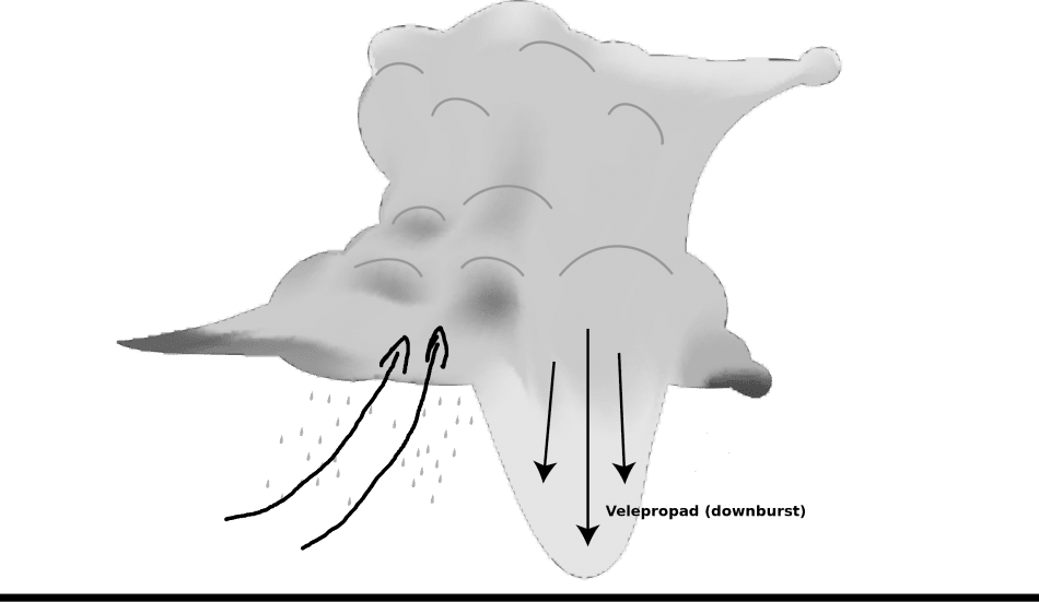 – Ovakva pojava naziva se u domaćoj meteorološkoj terminologiji velepropad, ali je svakako poznatija po engleskom nazivu downburst. Olujni oblak kumulonimbus ima generalno dvije vertikalne zračne struje; u svom prednjem dijelu oblak se formira u uzlaznoj struji toplog zraka, a u stražnjem dijelu dolazi do spuštanja hladnog zraka prema tlu (slika 1). Upravo je to spuštanje zraka u pozadini oblaka u pojedinim slučajevima izrazito jakog intenziteta i stvara orkanske udare vjetra na tlu. Branko Gelo u knjizi Opća i prometna meteorologija navodi da ovakvi sustavi mogu donijeti udare brzine i do 60 metara u sekundi. Iz toga je vidljivo kako pojava u Zadru nipošto nije sama po sebi nezabilježen ekstrem; međutim zbog svojeg malog prostornog protezanja se na nekom mjestu pojavljuje vrlo rijetko u ovako izraženom obliku.