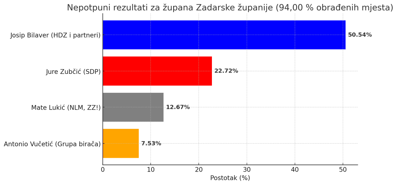 Prema najnovijim neslužbenim rezultatima lokalnih izbora za župana Zadarske županije, nakon obrađenih 235 od ukupno 250 biračkih mjesta (94,00 %), kandidat HDZ-a i koalicijskih partnera Josip Bilaver osvojio je 50,54 posto glasova, što ga vrlo vjerojatno vodi do pobjede već u prvom krugu.