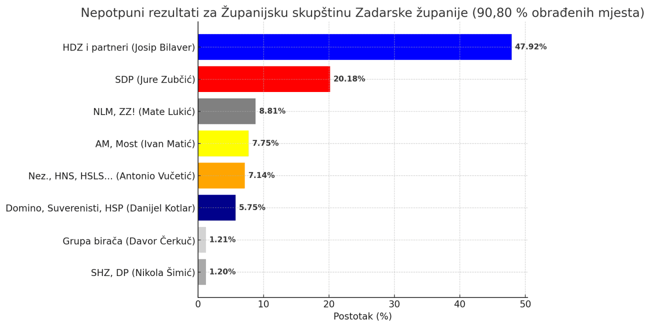 Prema neslužbenim i još uvijek nepotpunim rezultatima, nakon obrađenih 227 od ukupno 250 biračkih mjesta (90,80 %), HDZ-ova koalicijska lista koju predvodi Josip Bilaver ostvarila je uvjerljivo vodstvo na izborima za Županijsku skupštinu Zadarske županije.