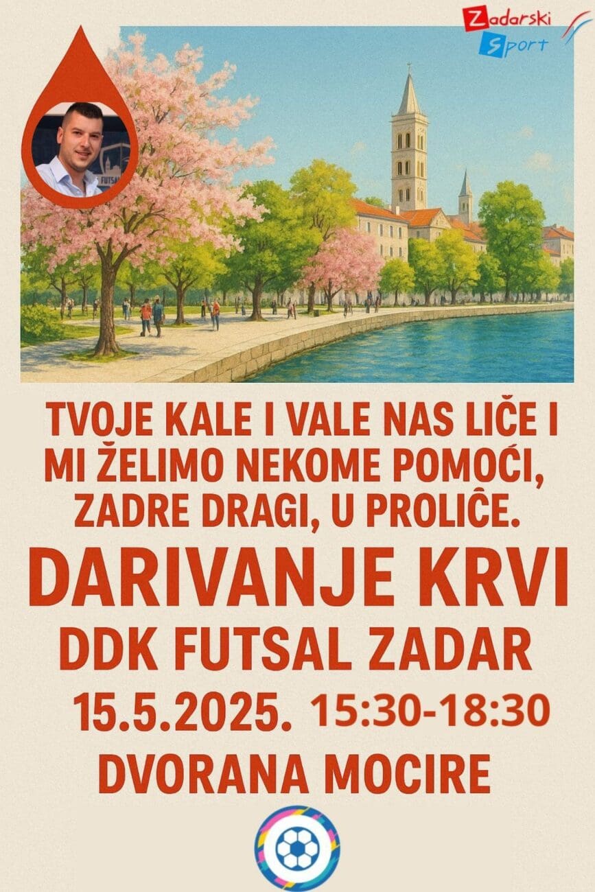 Udruga za mali nogomet Zadarske županije, u suradnji s Ivanom Jurićem, predsjednikom aktiva dragovoljnih darivatelja krvi (DDK), poziva sve građane, sportaše i političare na novu akciju darivanja krvi koja će se održati 15. svibnja u Sportskom centru Mocire, s početkom u 15:30 sati. Ova hvalevrijedna akcija, već peta po redu u organizaciji Udruge, još je jedan dokaz kako sport može biti više od igre – može biti snažna poruka zajedništva, solidarnosti i društvene odgovornosti.