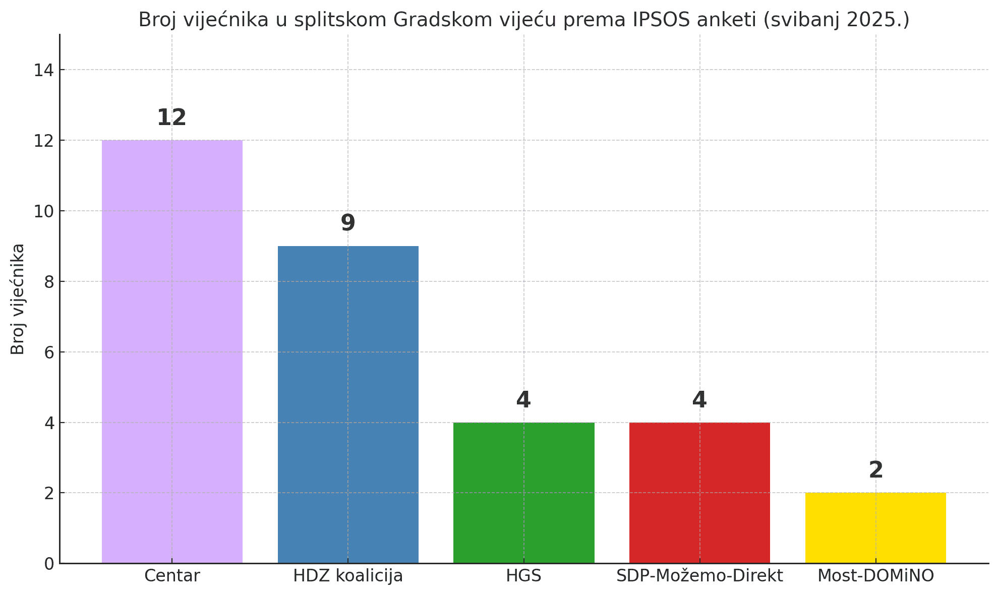 Usporedimo li podatke iz ankete s rezultatima posljednja dva izborna ciklusa, jasno se vide pomaci u oba bloka. Centar je na prijevremenim izborima 2022. osvojio impresivnih petnaest mandata, a sada ih gubi tri – signal da dio njihovih glasača traži alternative, ali ovu opciju u dalje podržava većina Splićana što se na izborima u Splitu iznimno rijetko kada je neka opcija na vlasti. HDZ, koji je 2022. pao na osam mjesta, vraća se na devet te ostaje najveća oporbena skupina. HGS, koji je 2022. potonuo na samo dva vijećnika, oživljava i vraća se na četvrto mjesto, dok je ljevica udvostručila snagu u odnosu na 2022., ali još uvijek ne doseže vrhunac iz 2021. Most, pak, lebdi tik iznad praga i zadržava minimalnu prisutnost.