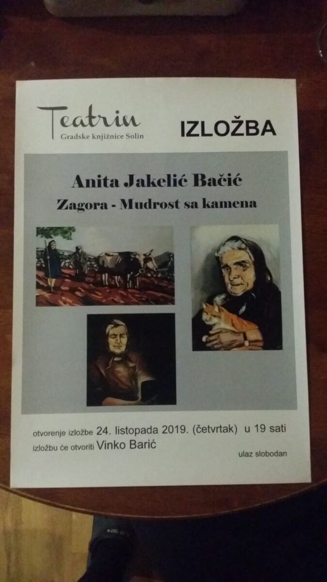 Na izložbi akademske slikarice Anite Jakelić Bačić nazvanoj Zagora - Mudrost sa kamena nećete naići ni na jedan pejzaž iz Dalmatinske zagore, nijedan suhozid i nijednu kamenu kuću ili pojatu. Na ovim slikama nalaze se starice, bakice zabavljene mobitelima ili obuvene u najmodernije patike.