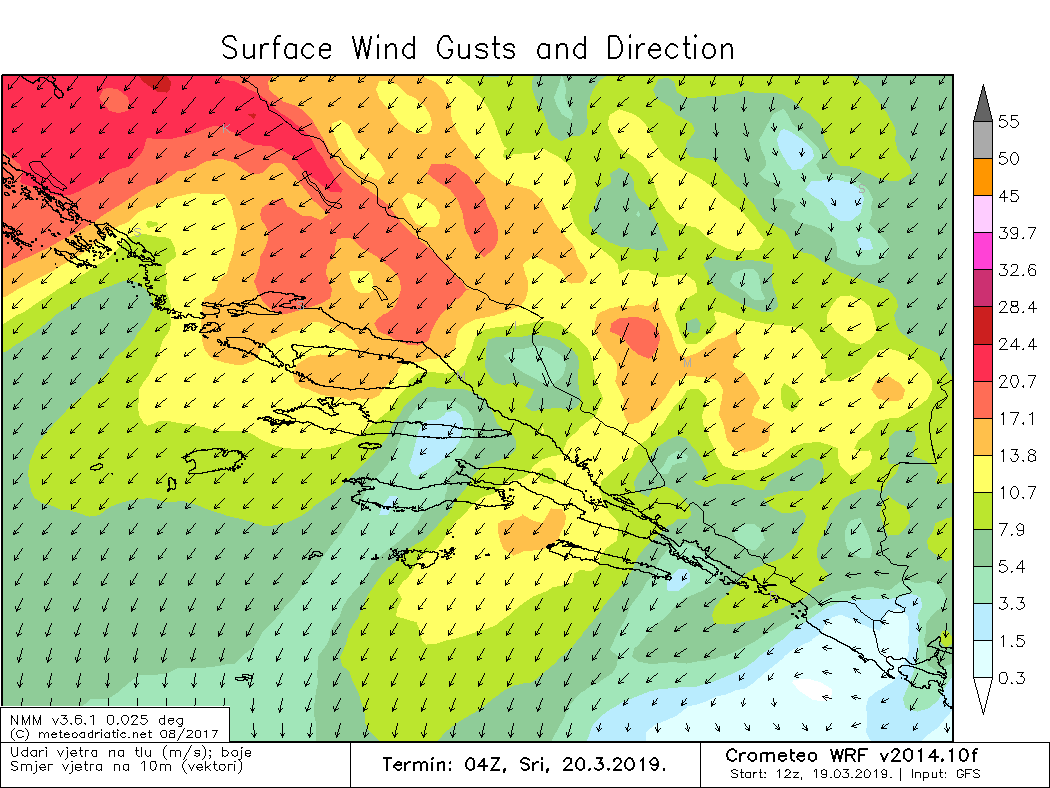 Predvečer je hladna fronta stigla do srednje Dalmacije pa je i tamo uslijedio pad temperature zraka koji je bio znatno manje izražen nego jučer na sjevernom Jadranu. Primjerice, nakon što je u Cetinskoj krajini danas temperatura zraka rasla do 14°C, u 19 sati tamo se mjerilo znatno svježijih 5 do 7°C, a u Splitu je temperatura pala s 15 na 10°C.