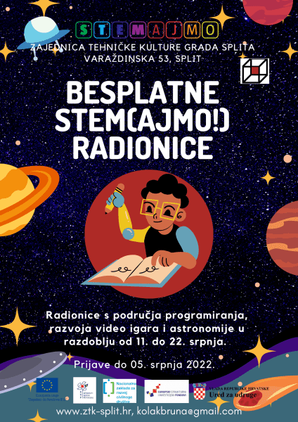 "Radionice će se održavati od 11. do 22. srpnja 2022., a prijave se zaprimaju do 05. srpanja 2022.. Radionice su u potpunosti besplatne, a broj polaznika radionica je ograničen. Prijavnicu za STEM(AJMO!) radionice možete pronaći na linku (http://www.ztk-split.hr/događanja/besplatne-radionice-u-organizaciji-ztk-grada-splita-u-sklopu-projekta-stemajmo-1), a ispunjenu pošaljite na mail kolakbruna@gmail.com.