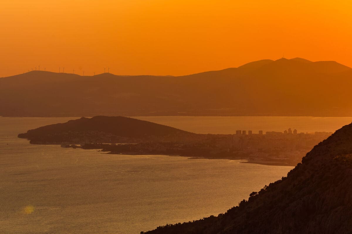 Predivan narančasti smiraj dana nad Splitom snimio je poznati fotoreporter Zvonimir Barišin. On se za ove fotografije morao popeti na mitsko brdo Perun iznad Žrnovnice i Podstrane odakle se pružao pogled na Split, Dugi Rat i otoke.