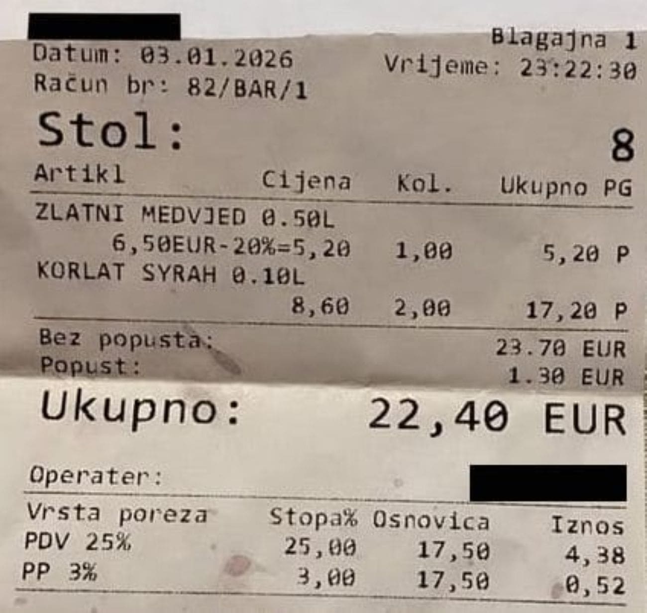 Ogorčeni Splićanin objavio je račun iz jednog splitskog bara u kojem je i usred zime cijena takva da će vam se zamantati i prije nego vas omami alkohol.