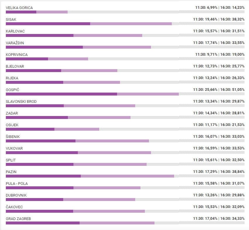 Do nedjelje u 16:30 glasovalo je 29,18 posto, što je 6,36 posto manje nego u prvom krugu kada je glasovalo 35,54 posto. U drugom krugu lokalnih izbora prije četiri godine do 16:30 glasovalo je 27,45 posto birača.