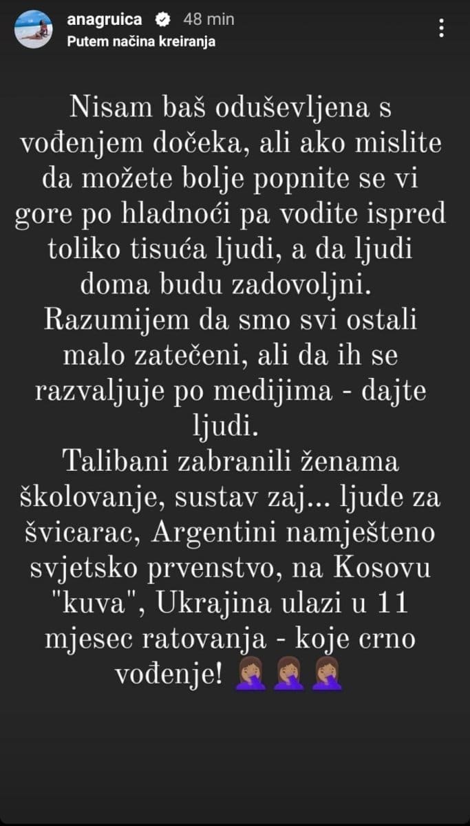 "Razumijem da smo svi ostali malo zatečeni, ali da ih se razvaljuje po medijima - dajte ljudi. Talibani zabranili ženama školovanje, sustav zaj...ljude za 'švicarac', Argentini namješteno Svjetsko prvenstvo, na Kosovu 'kuva', Ukrajina ulazi u 11. mjesec ratovanja - koje crno vođenje", jasno je zaključila Ana Gruica.
