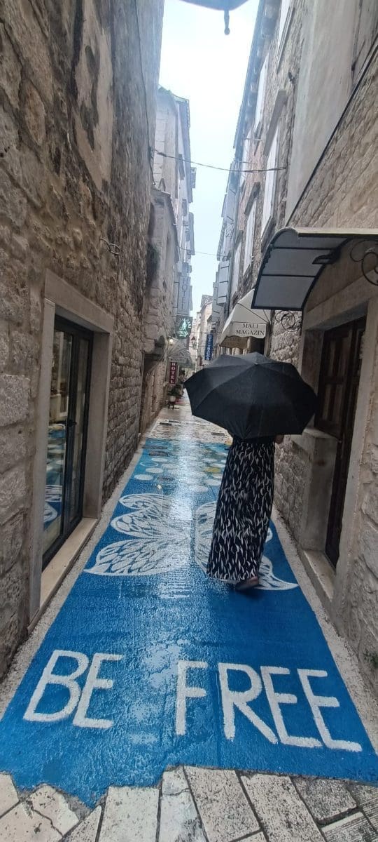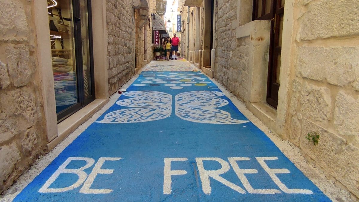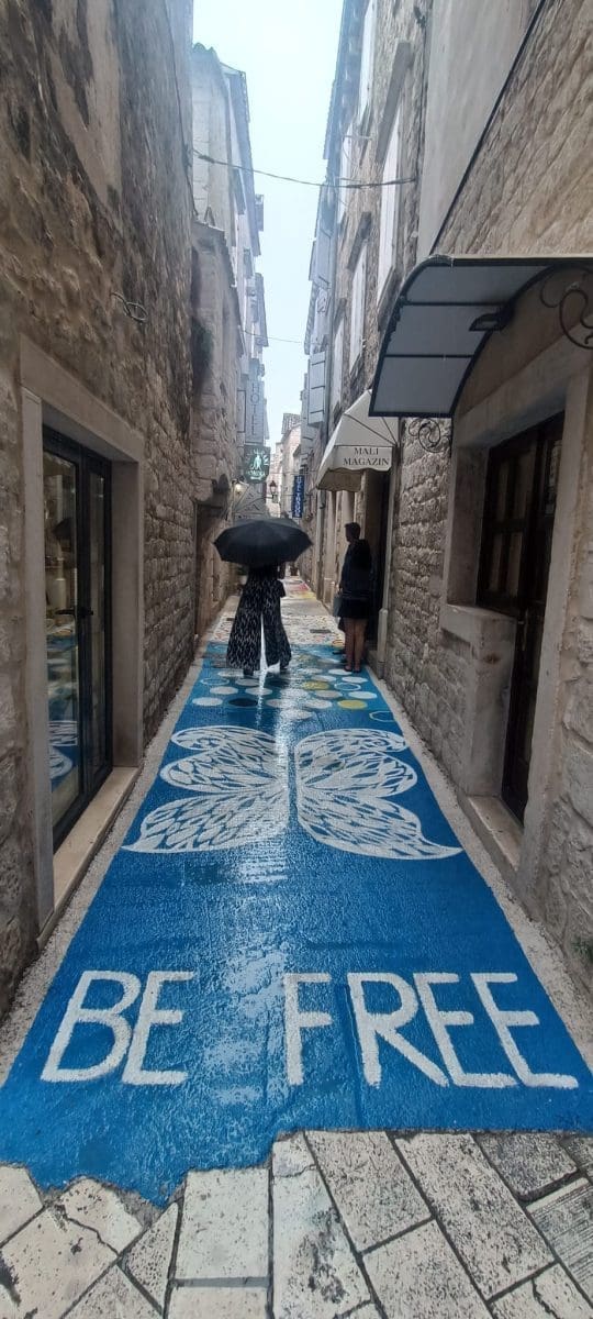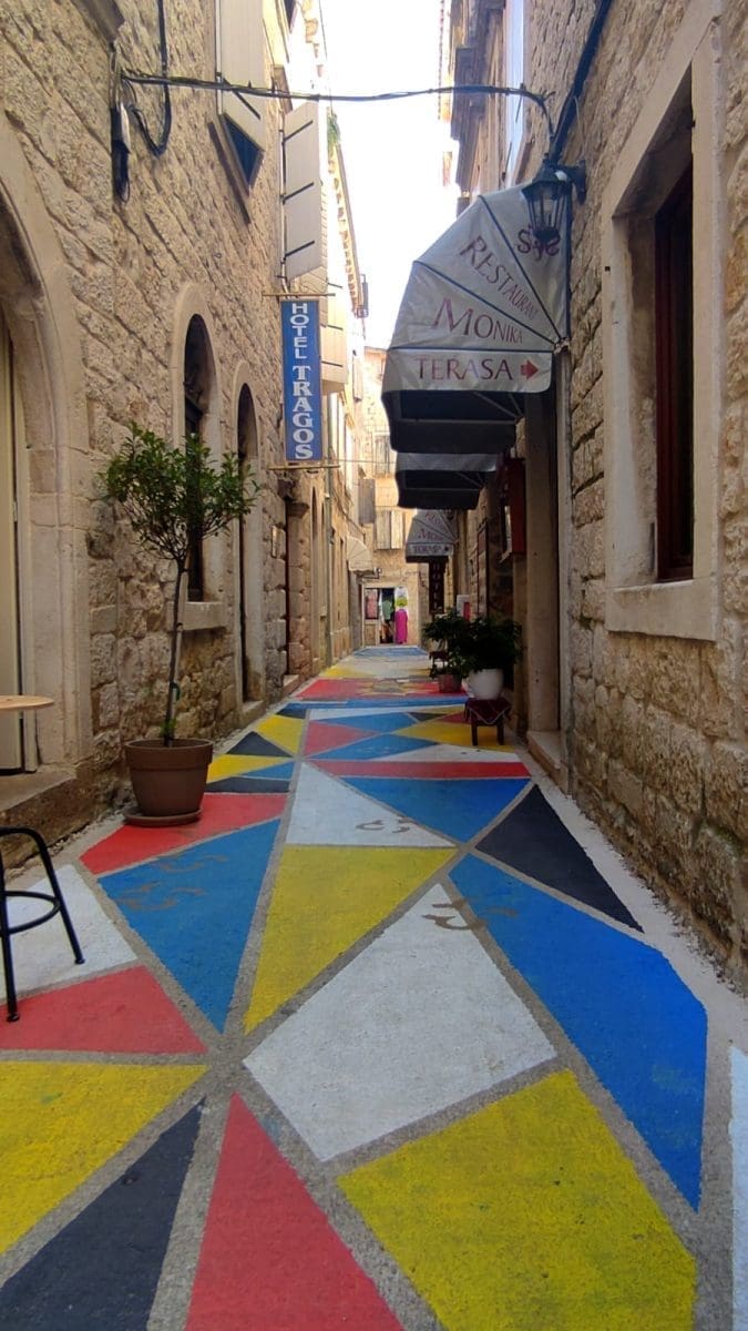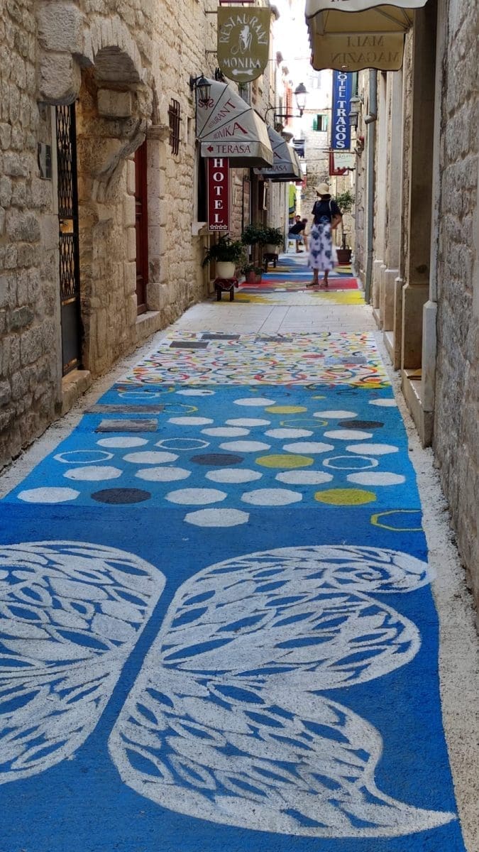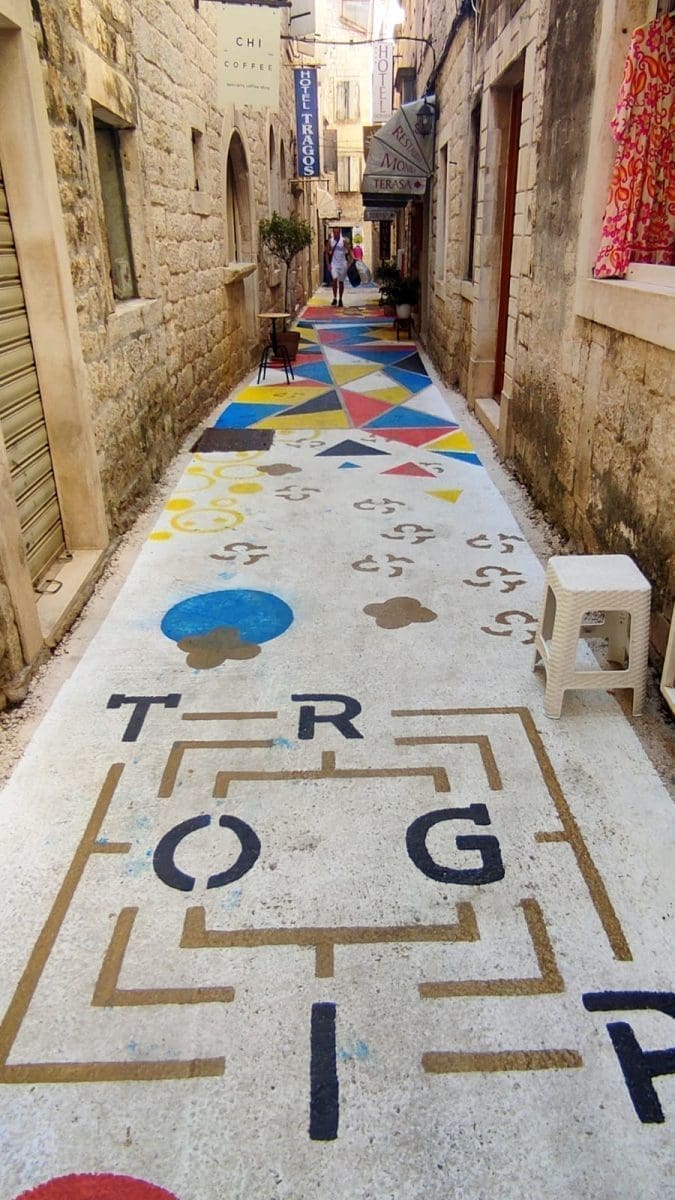 Korištene su osnovne boje, a glavni motivi bili su geometrijski likovi, kamen koji nedostaje u ulici, krila slobode i umjetnosti, ali naravno i motivi brandinga grada te trogirska trlja koja se tek nekoliko metara dalje nalazi uklesana od tko zna kada u jedan kamen.