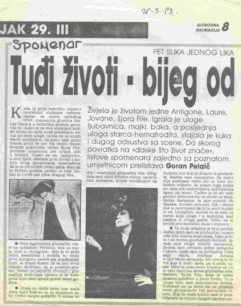 - Hvala vam. Jedan od najvećih mojih glumačkih i životnih doživljaja je Antigona koju sam na splitskom Peristilu igrala punih deset godina, pa zatim cijeli ciklus Krleže. Ova zadnja malo veća uloga, Sabina u Trilogiji o ljetovanju Carla Goldonija, donijela mi je dvije nagrade, nagradu na posljednjem MES-u u Sarajevu i Zlatni smijeh u Zagrebu. Bilo je puno uloga koje su mi prirasle srcu a bilo je i takvih koje nisam voljela. E, sad Šjora File... to je moj život. Meni je žao što je više ne igram premda sam sama tražila da je ne igram jer sam prestara za tu ulogu. Zanimljivo je da sada dobivam puno više komplimenata za nju nego za vrijeme dok sam je igrala. Ali, sve je to stvar prošlosti i nekih davnih sjećanja od kojih živim. Pa i sada, u ovoj bolničkoj postelji, u teškim mukama nakon operacije, prisjetim se nekih lijepih trenutaka doživljenih u privatnom životu i na sceni. Možda ovo i jeste kraj moje glumačke karijere, godine su tu a sada i ova nesreća. Hoću li moći hodati? Ne znam! Ako bude neka uloga "u kolicima" - tu sam. Važno je igrati!