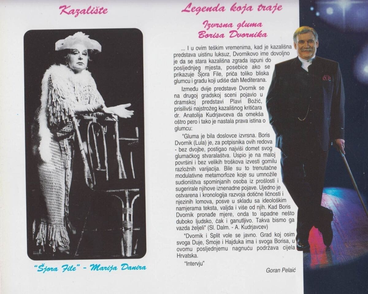 Uz Miljenka Smoju, Ivu Tijardovića, uz Zdenka Runjića, Franu Matošića, Luku Kaliternu, Zdravku Krstulović, Anu Roje, Đurđicu Bjedov, Gorana Ivaniševića i još nekolicinu uglednika, Boris Dvornik (1939. - 2008.) nedvojbeno je bio i još je simbol grada pod Marjanom. Splićani su ga uvijek prihvaćali kao običnog sugrađanina. Nikada sa sobom nije nosio glumačke živote izvan scene, kako se katkada (možda i često) zna dogoditi u životima drugih glumaca, koji su teško ulazili u tuđe živote, a još teže iz njih izlazili. Jednostavnost je ono što ga je činilo velikim i malim…