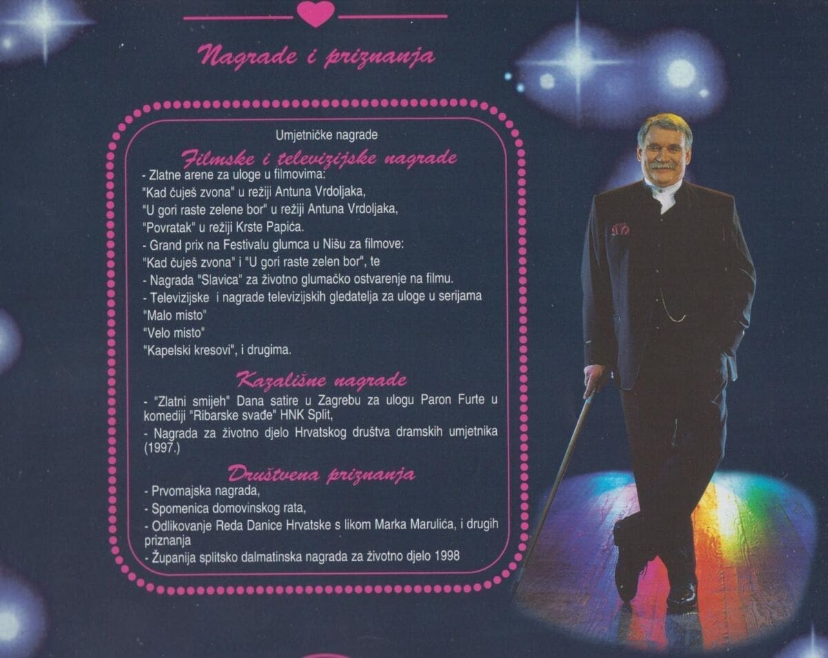 - Teško je to meni kazat. Tribalo bi odvojit film od televizijskih serija, jer one su daleko popularnije. Televizija je ta koja daje popularnost glumcu. U ono vrime kada san ja započinjao s glumačkom karijerom, a bilo je to s početka šezdesetih, onda je film bija jako popularan kod ljudi. Bilo je malo ljudi koji su imali televiziju, i glumci su letili iz filmova ka’ popularne osobe. Ali kasnije, kada je televizija došla, kada se proširila i postala dostupna svima, onda je ona to preuzela i televizijski glumci su bili znatno popularniji. Ne, ne mogu van kazat jedan film ili ulogu, ali kad bih birao između filmova, onda bi izbor pa na one filmove koje sam radija s Antunom Vrdoljakom. Te filmove bi stavio ispred svih, jer su snimani po dobroj literaturi. Vrdoljak se uvik naslanja na dobre pisce, na Marinkovića, Šibla, Krležu...A što se televizijskih serija tiče, tu su „Malo misto“ i „Velo misto“, dvi serije koje su izbacile u prvi plan ne samo mene nego gotovo sve glumce koji su se pojavili. A znate i sami šta je učinija Roko i Meštar. I „Kapelski kresovi“, to je bila popularna serija, u kojoj san igra. Tako san ti ja lipo, kume moj, pokrija cili teritorij Hrvatske, cili teren. I bićedu me zato ove godine pozvali da buden prešidente žirija na filmskom festivalu u Puli.