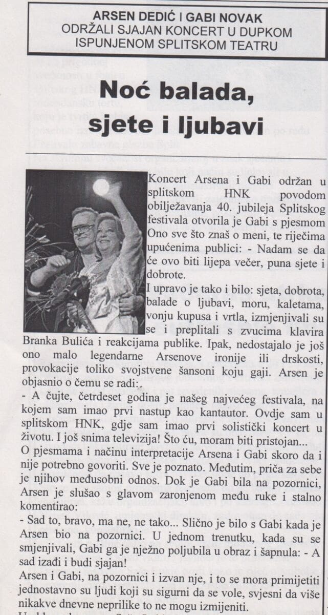 Finalnoj večeri možda se i ne bi toliko trebalo prigovoriti. O nagradama bi se moglo raspravljati, ali to je izlišno jer su one poznate već nekoliko mjeseci. Pitanje je samo jedno: Je li to Splitski festival i u kakvom je glazbenom rodu ono što smo slušali tri večeri s nekadašnjim profilom Splita? Što se pjesama tiče, apsolutno je najbolja ona Deana Dvornika Balada o Šarku. Ali što vrijedi kad je pjesma već bila izvedena u okviru Splitskog ljeta u predstavi Pasje novelete.