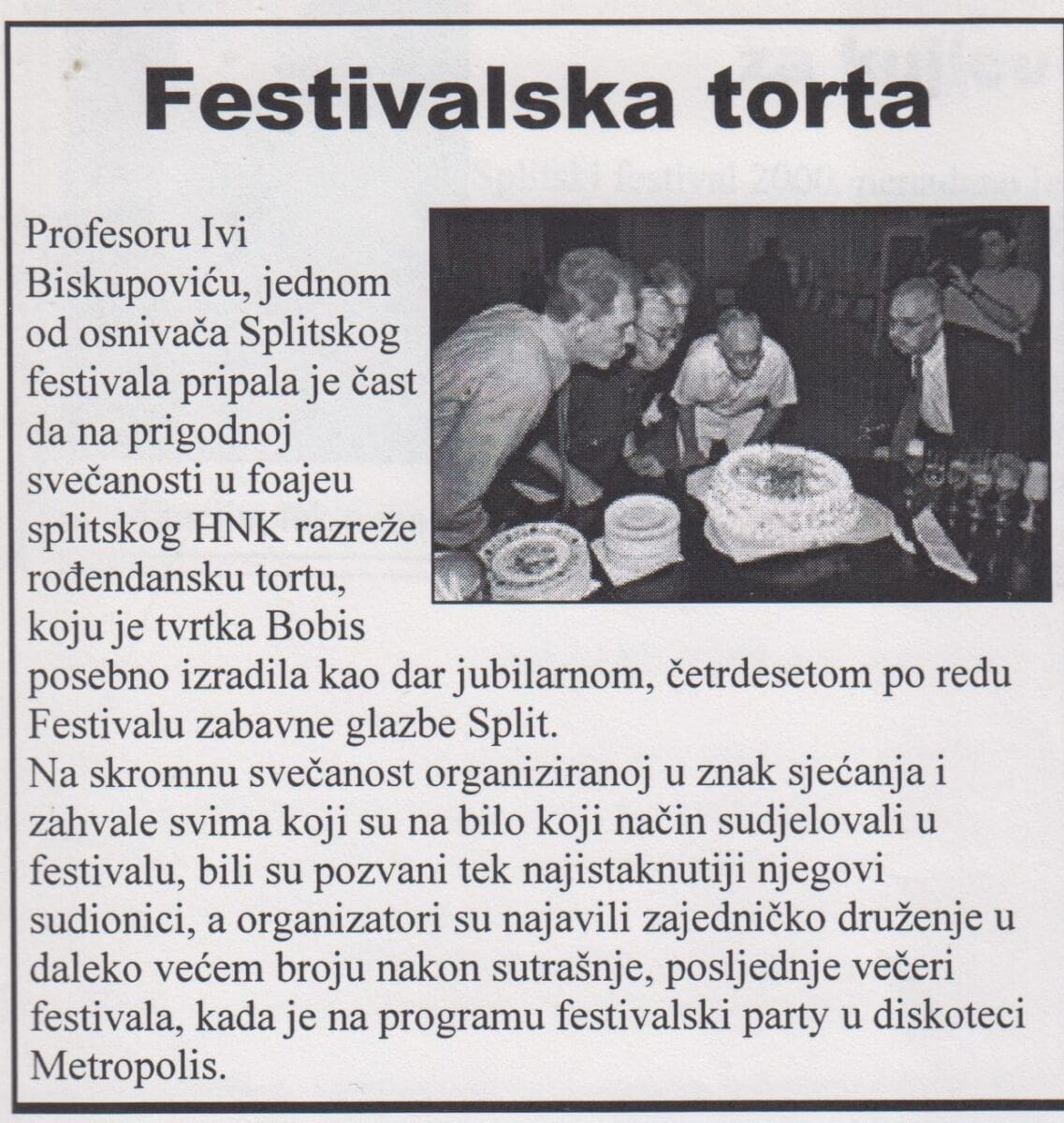 Zdravicom Saše Lukića, direktora Splita 2000, koji je još 1967. sa Delfinima nastupao na Festivalu (inozemna alternacija su im bili The Shadows) započelo je kratko prisjećanje na proteklih 40 godina Festivala. Od POŠK-a do Prokurativa, od Melodija Jadrana do Festivala Split, 20-ak uzvanika pozdravili su i riječi Arsena koji je na Festivalu nastupao još 1962. a svoj rastanak od Prokurativa nazvao je nesporazumom. Čast da zareže rođendansku tortu i pokuša ugasiti 40-ak svjećica pripala je prof. Josipu Biskupoviću, jednom od četiri osnivača festivala. Profesor je pokušao ugasiti svjećice, ali nije išlo. U pomoć su priskočili Lukić, Bašić, Pelaić, Vilović, ali opet nije išlo. Na torti su bile svjećice koje se ne mogu ugasiti, pa su se prilikom svakog gašenja ponovno palile.