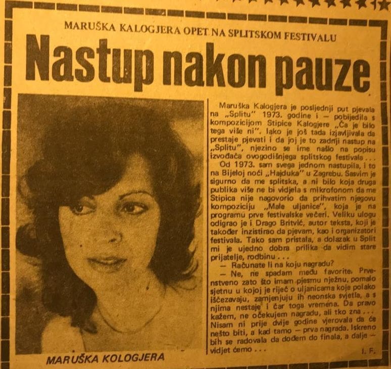 Bilo je ljeto na Bačama. A bio je i Festival! Godina 1963. Sjećam se da je te godine jedna krasna djevojka Jadranka Tokić također pravila svoje prve korake u još nestvarniji svijet novinarstva. I sjećam se da smo joj zajedno pristupili i zamolili za razgovor. I sjećam se da je ta nestvarna Maruška bila jednostavna, posve obična. Što je Jadranka objavila ne sjećam se ali znam da mi je nekoliko dana nakon tog susreta izašao tekst razgovora s Maruškom i da mi je sjajni fotoreporter Stjepan Šimić dao njenu fotografiju i da mi je bilo krivo što će ta fotografija ostati u redakciji. Ali, sad je nebitno to. Krenulo je a i stvoreno je jedno istinsko prijateljstvo s Maruškom. I to dugogodišnje. I sad se čujemo. Javi se u pravilu Stipica, sjajni skladatelj, aranžer, dirigent i suprug Maruškin.