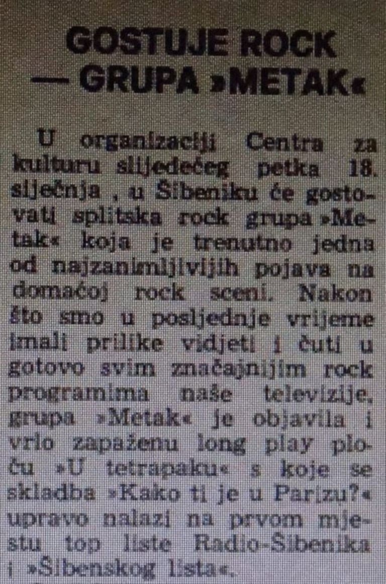 Bilo je to još uvijek vrijeme nekog glazbenog sanjarenja, traženja u svim mogućim sferama, pa i u onomu što se zove rock, sa svim mogućim kotrljajućim varijacijama. I tako se godine 1978., u tom istom Splitu, okupila grupica zanesenjaka i stvorila nešto što čak i današnja generacija poznaje pod imenom Metak. I kao jedna od mogućih verzija rocka počeli su svirati, ne po frontama, jer nisu bili baš od tog formata, za plesnjake. Ali, imali su svoju publiku. Tim prije jer su bili prva splitska grupa tog i takvog izričaja. I to s vlastitim skladbama! Evo ovako je pisalo u „školskom dnevniku“: Doris Tomić, klavijature, na basu Mirko Krstičević, bubnjevi Matko Jelavić, vokal Ranko Boban, gitara Željko Brodarić Jappa i naravno još jedan na gitari; Zlatko Brodarić! Sad sam nabrojio sve, ali kako to već biva, uvijek netko dolazi i odlazi, otišli su Doris i Ranko i ustalila se četvorka; Matko, Zlatko, Mirko i Jappa. Obišli su cijelu tadašnju državu, bili na vrhu tadašnjih top-lista Yu rock scene, dali nekoliko hitova, donijeli neki novi zvuk u splitske kale, malo žešća rokija - u vrijeme dok još uvijek caruju sastavi za plesnjake. Bili su malo čudo kad su se pojavili na Festivalu zabavne glazbe Split'78, koji nije baš preferirao rock grupe. Te godine sudjelovali su s dvije pjesme: Šijavica i Gastarbajterska, potpisane od Mirka Krstičevića i Momčila Popadića.