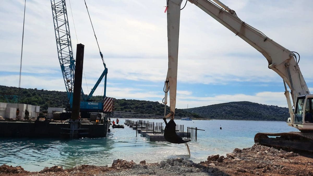 U tijeku su završni radovi podmorskog iskopa koji je priprema za montažu za armirano betonskih konstrukcija obalnih zidova i buduće pristanišne rampe.