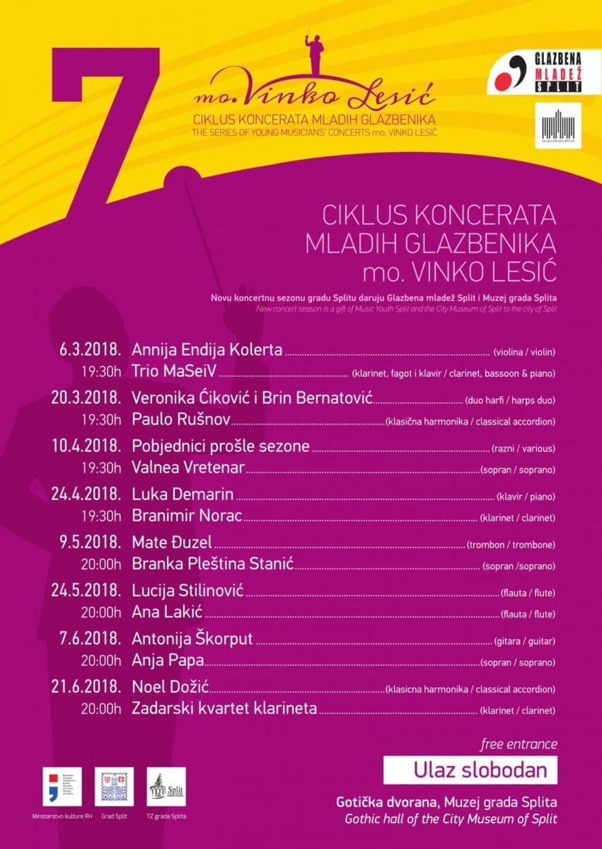Svečano otvorenje VII Ciklusa koncerata mladih glazbenika mo. Vinko Lesić će se održati u utorak 6. ožujka u 19.30 sati, u Gotičkoj dvorani Muzeja grada Splita. Nastupaju: Annija Endija Kolerta – violina (Latvija) i Trio Maseiv – klarinet, fagot i klavir (Hrvatska)