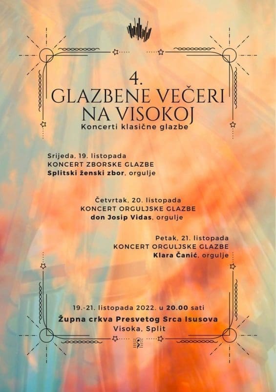 Četvrto izdanje festivala klasične glazbe u Župi Presvetog Srca Isusova na Visokoj u Splitu održat će se od srijede 19. do petka 21. listopada kao dio priprave za blagdan župnog supatrona, sv. Ivana Pavla II, inače velikog ljubitelja umjetnosti.