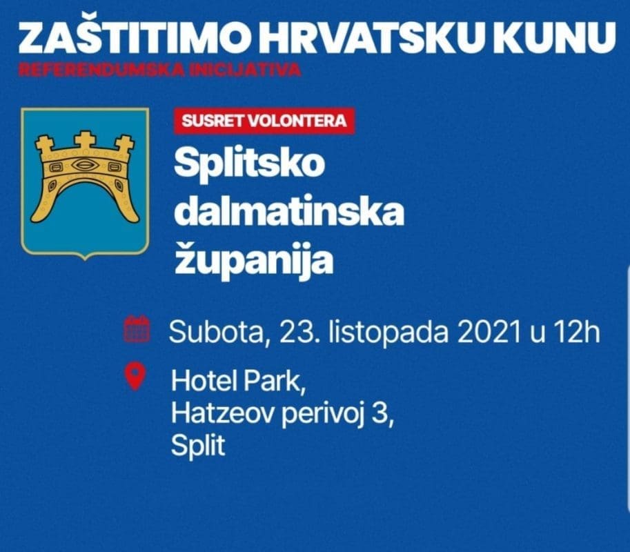 U subotu 23. listopada, s početkom u 12 h u hotelu Park u Splitu održat će se sastanak s volonterima referendumske inicijative ZAŠTITIMO HRVATSKU KUNU.