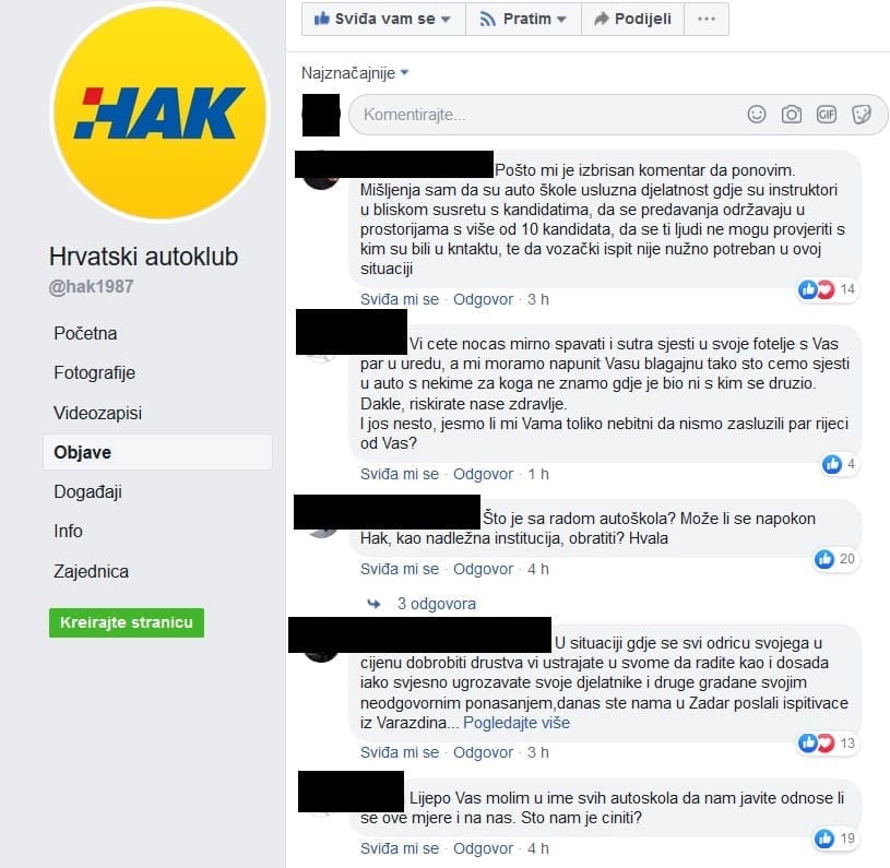 "Što je s radom autoškola? Može li se napokon HAK, kao nadležna institucija, obratiti? Hvala" - bilo je pitanje koje se učestalo ponavljalo. Kako na ta pitanja nije bilo odgovora, korisnici su počeli stavljati brojne komentare, ogorčeni da im HAK ne odgovara. Dio njih požalio se da im se brišu komentari pa su ih morali ponavljati.