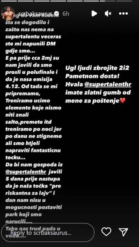 - Što se dogodilo i zašto nas nema na Supertalentu večeras ste mi napunili DM gdje smo...E pa prije cca dva mjeseca su nam javili da smo prošli u polufinale i da je naša emisija 4.12. Od tada se mi pripremamo, treniramo, učimo elemente koje nismo niti znali - salto, premete itd. Treniramo po noći jer po danu ne stignemo, ali smo htjeli napraviti fantastičnu točku... Da bi nam gospoda iz Supertalenta javili pet dana prije nastupa da je naša točka 'preriskantna za live' i da nam nisu u mogućnosti postaviti park koji smo naručili.... Tako naš trud pada u vodu... - napisao je ogorčeni Filip i dodao: