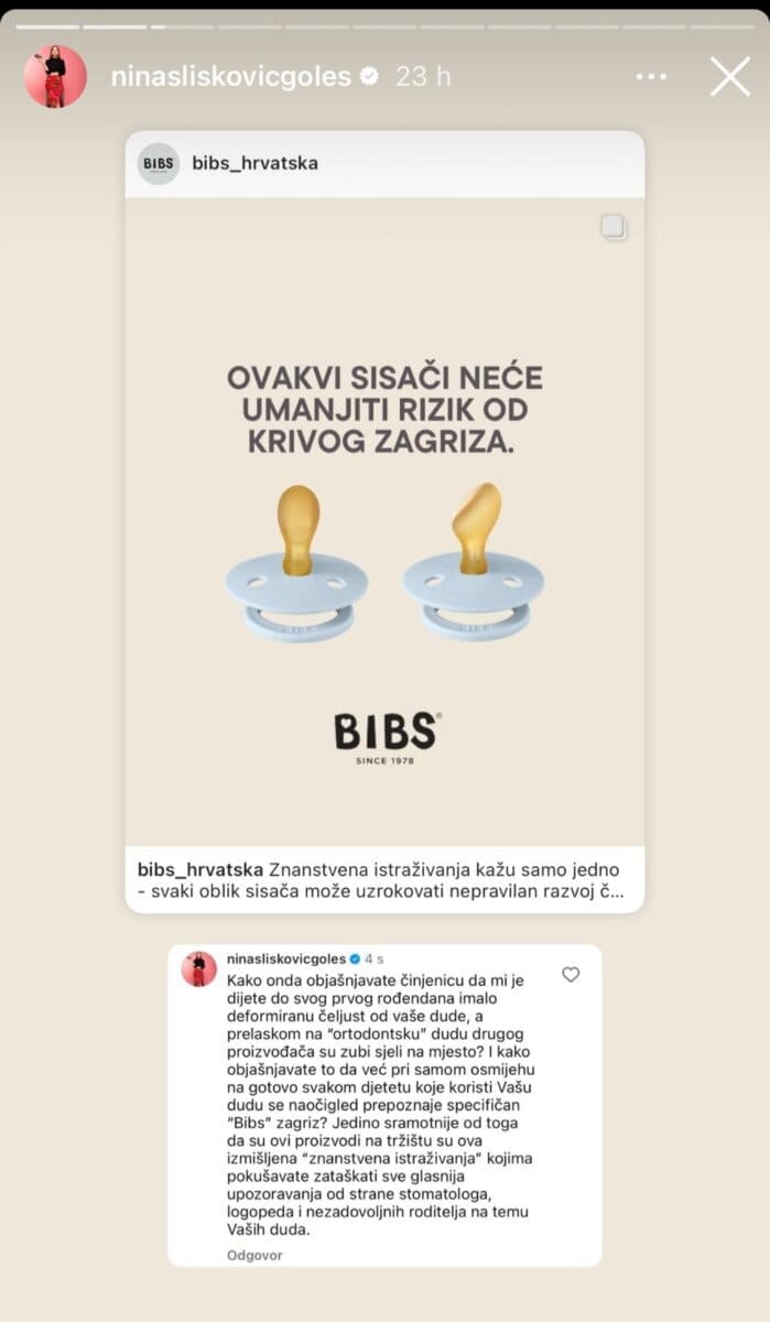 „Kada sam odlučila o svemu progovoriti javno, kako bih podigla malo razinu svijesti o tom problemu i kako bih upozorila druge roditelje iz pozicije mame koja je pogriješila s odabirom i osjetila na svojoj koži svu paletu grižnje zbog svog odabira, počelo mi se javljati jako, jako puno pedijatara, logopeda i stomatologa, svi mahom s istom tezom - taj oblik dude je najgore što se djetetu može ponuditi. O količini poruka roditelja i fotografija zubića njihove djece koja koriste spomenutu dudu da ni ne krećem, radi se o stotinama poruka. Nagledala sam se toliko tih fotografija s naočigled istom deformacijom zubića i čeljusti, da i dan danas na ulici točno prepoznam koje dijete koristi Bibs dudu tog oblika, bez da dudu vidim. Tzv. 'Bibs zagriz'“, govori nam Nina te na kraju upućuje savjet roditeljima.
