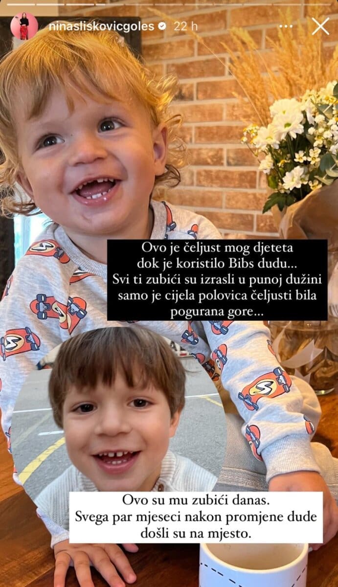 „Moj prvi sin je koristio Bibs dudu nipple oblika do svojih godinu i pol dana otprilike. Do tog trenutka su mu od zubića u potpunosti izrasle jedinice, dvojke i trojke, ali mu je cijeli desni dio gornje čeljusti bio “podignut” prema gore, do te mjere da je kada bi se nasmijao izgledao kao da taj dio zubića ni nema. Primijetila sam to odmah, jer bilo je nemoguće ne primijetiti, a kada sam kod jedne poznanice na Instagramu vidjela priču o učinku Bibs duda sa slikom zubića njene kćeri, bilo mi je jasno da je duda krivac i u našem slučaju i odlučila ju istog trenutka zamijeniti“, započinje Nina.