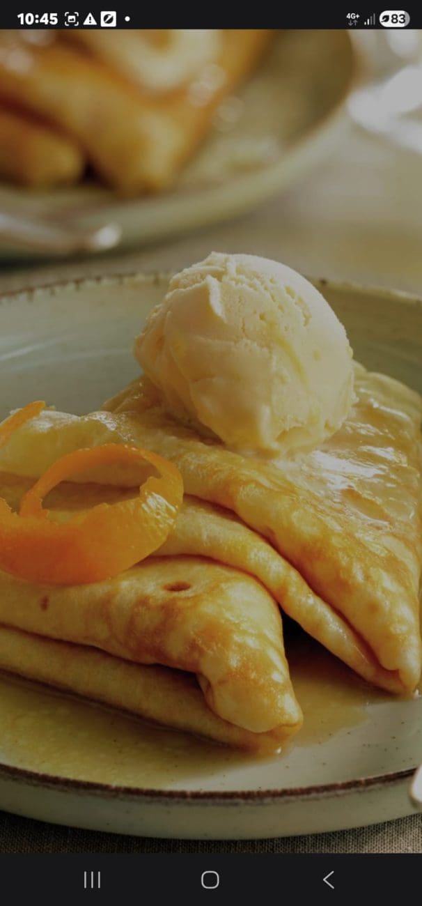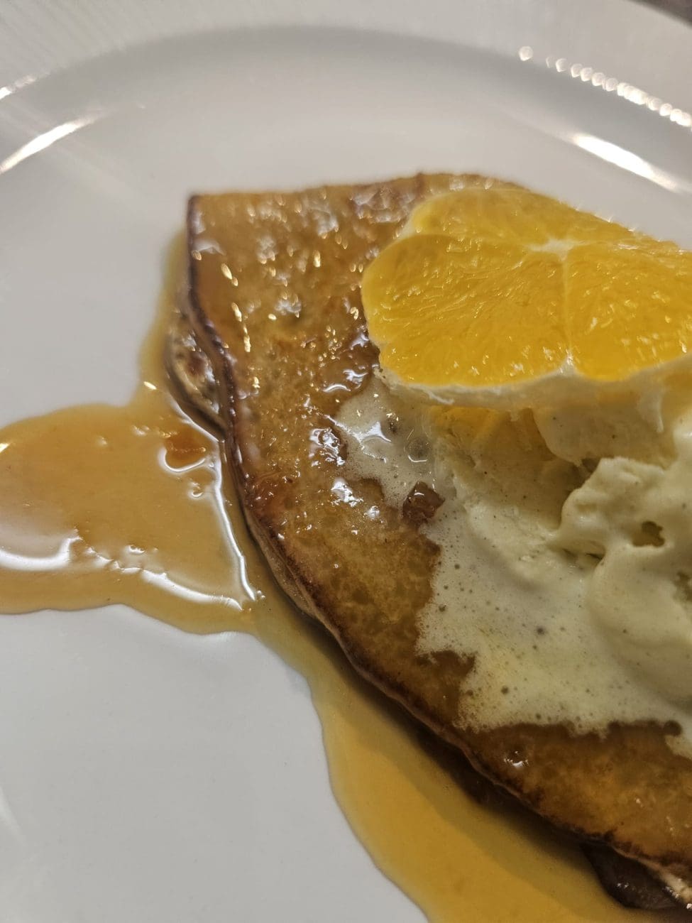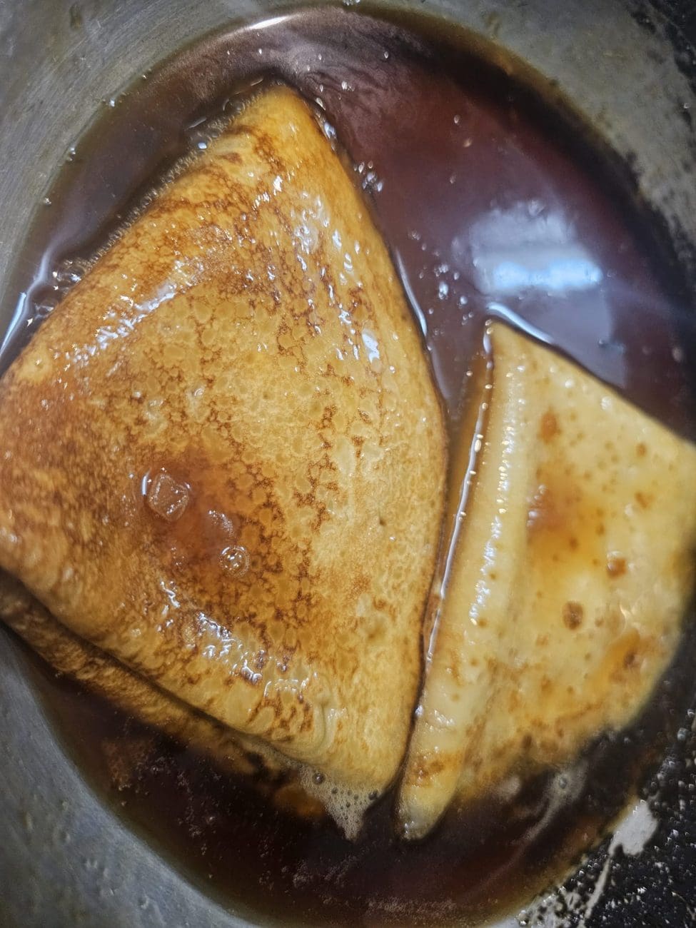 I to u njezinom fantastičnom obliku — Crêpes Suzette. Palačinke natopljene sirupom od naranče i karameliziranog šećera, flambirane prije serviranja. Recept star još iz 19. stoljeća.