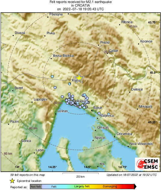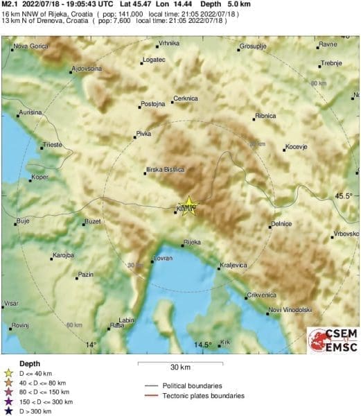 Magnituda mu je bila 2.1 prema Richteru, a epicentar 16 kilometara sjeverozapadno od Rijeke.