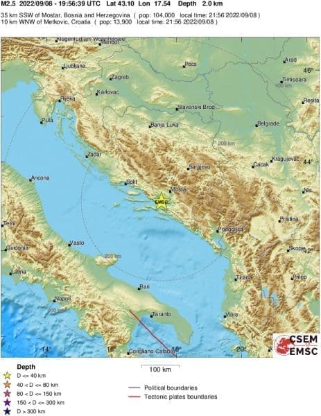 Kako je izvijestio EMSC, potres se dogodio u 21 sat i 56 minuta.