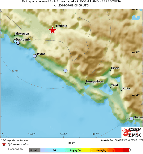 Jutros u 8:04 sata dogodio se umjeren potres s epicentrom u Bosni i Hercegovini, 14 km istočno od Dubrovnika, izvjestio je Seizmološki zavod.