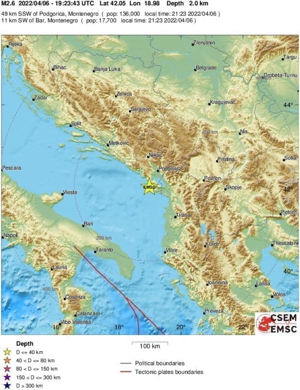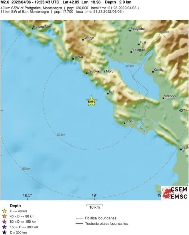 Prema podacima EMSC-a magnituda potresa je iznosila 2.6 prema Richteru, a epicentar je bio 11 kilometara jugozapadno od Bara.