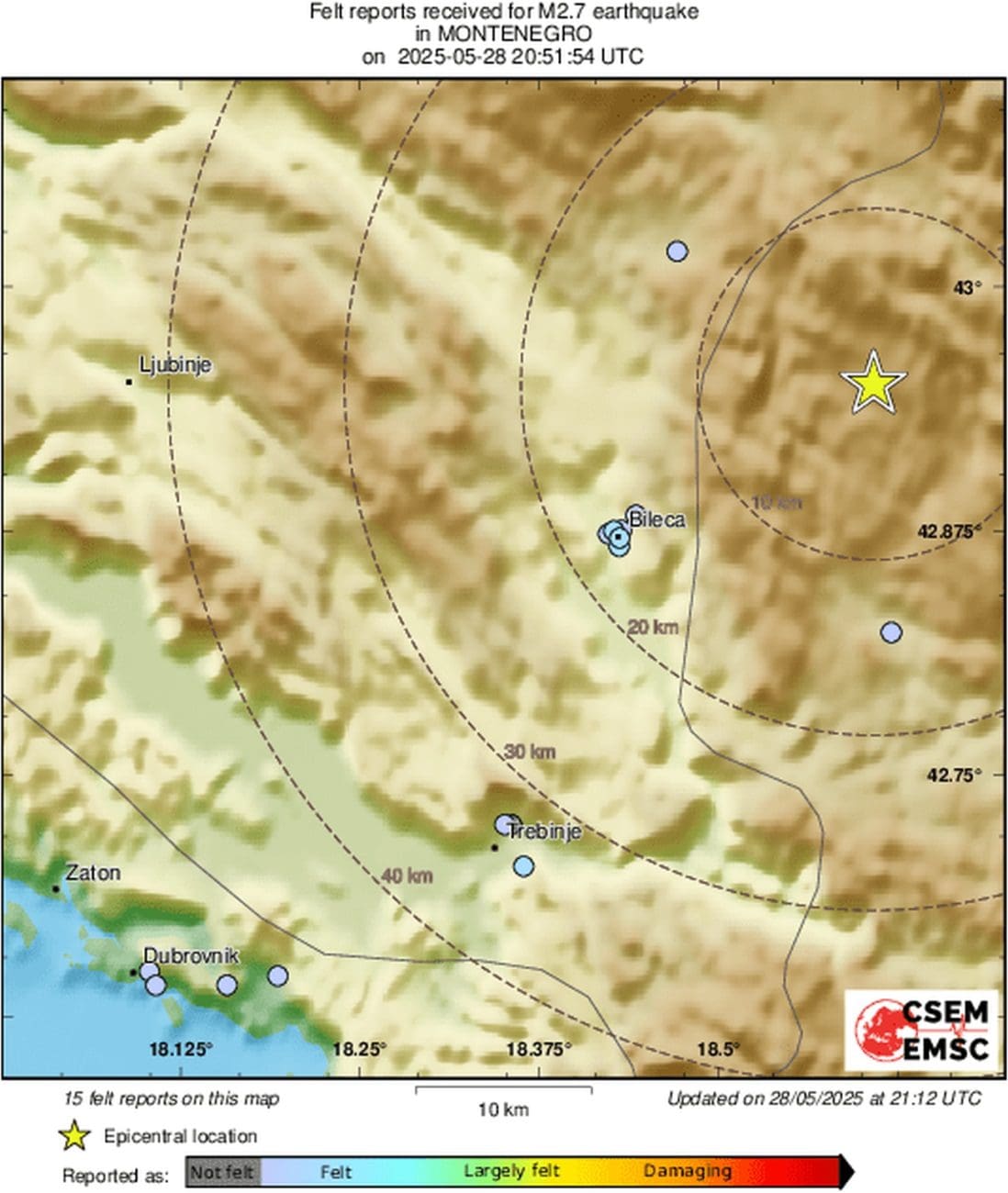 Prema podacima EMSC-a magnituda potresa je iznosila 2,7 prema Richteru, a epicentar je bio 17 kilometara sjeveroistočno od Bileće.